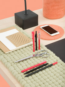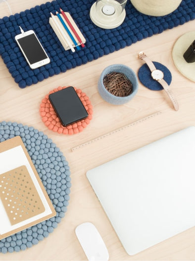 Un posto di lavoro bello e ordinato favorisce la concentrazione. Perché in un ambiente ordinato puoi lavorare in modo più efficace e più piacevole. I cestini e i sottobicchieri in feltro di myfelt servono come piccoli ausili organizzativi. La loro struttura robusta e morbida donano allo studio un'atmosfera speciale. I cestini in feltro di diverse dimensioni e colori non solo creano ordine sulla scrivania, ma fanno anche bella figura su credenze, scaffali e tavolini. Cellulari, cuffie, penne e altri materiali di lavoro sono a portata di mano sui sottobicchieri.
