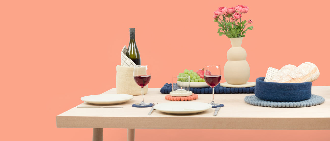 Piccoli accessori di myfelt modellano sottilmente l'atmosfera della sala da pranzo. Le pentole e i sottobicchieri in vetro di alta qualità in molte versioni diverse non solo portano un bel colore sulla tavola, ma si rivelano anche particolarmente funzionali e durevoli. myfelt I sottobicchieri sono realizzati in pura lana vergine e proteggono le superfici sensibili come legno e vetro da macchie e graffi.