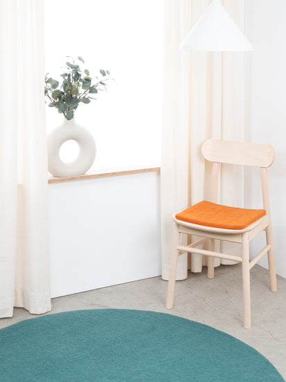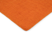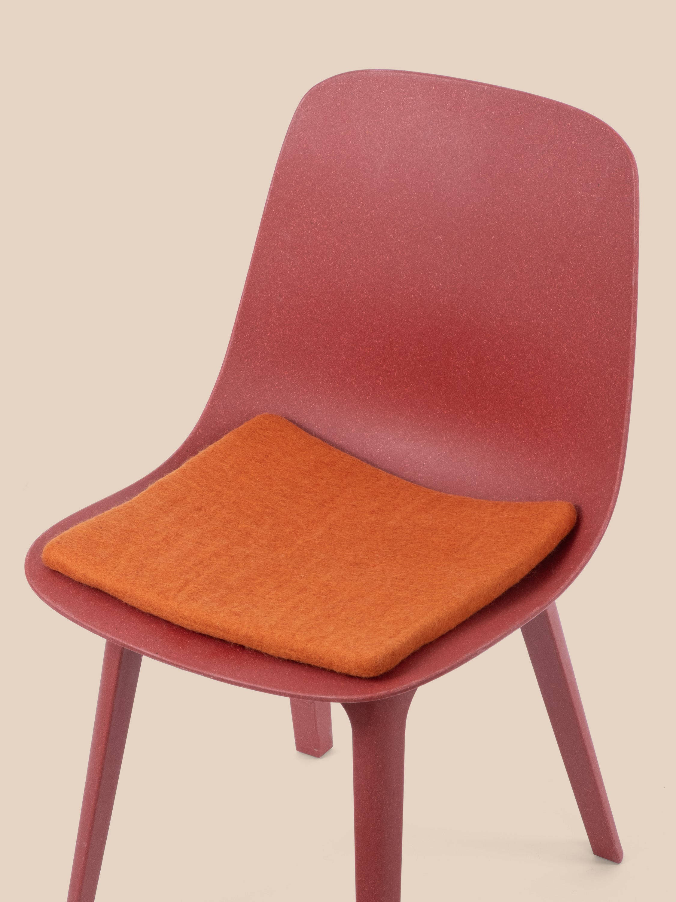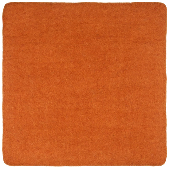 Quadratische, orangefarbene flache Sitzauflage aus reiner Schurwolle.