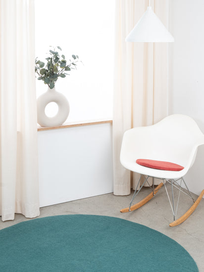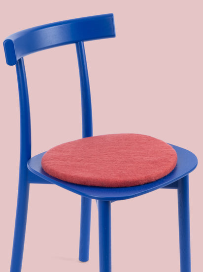 Runde, weinrote flache Sitzauflage aus reiner Schurwolle.