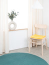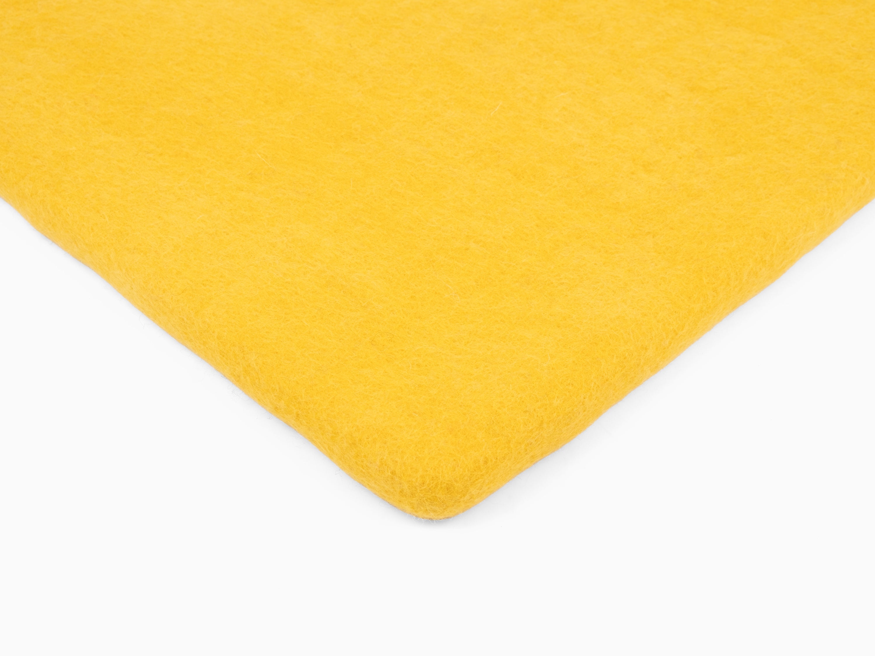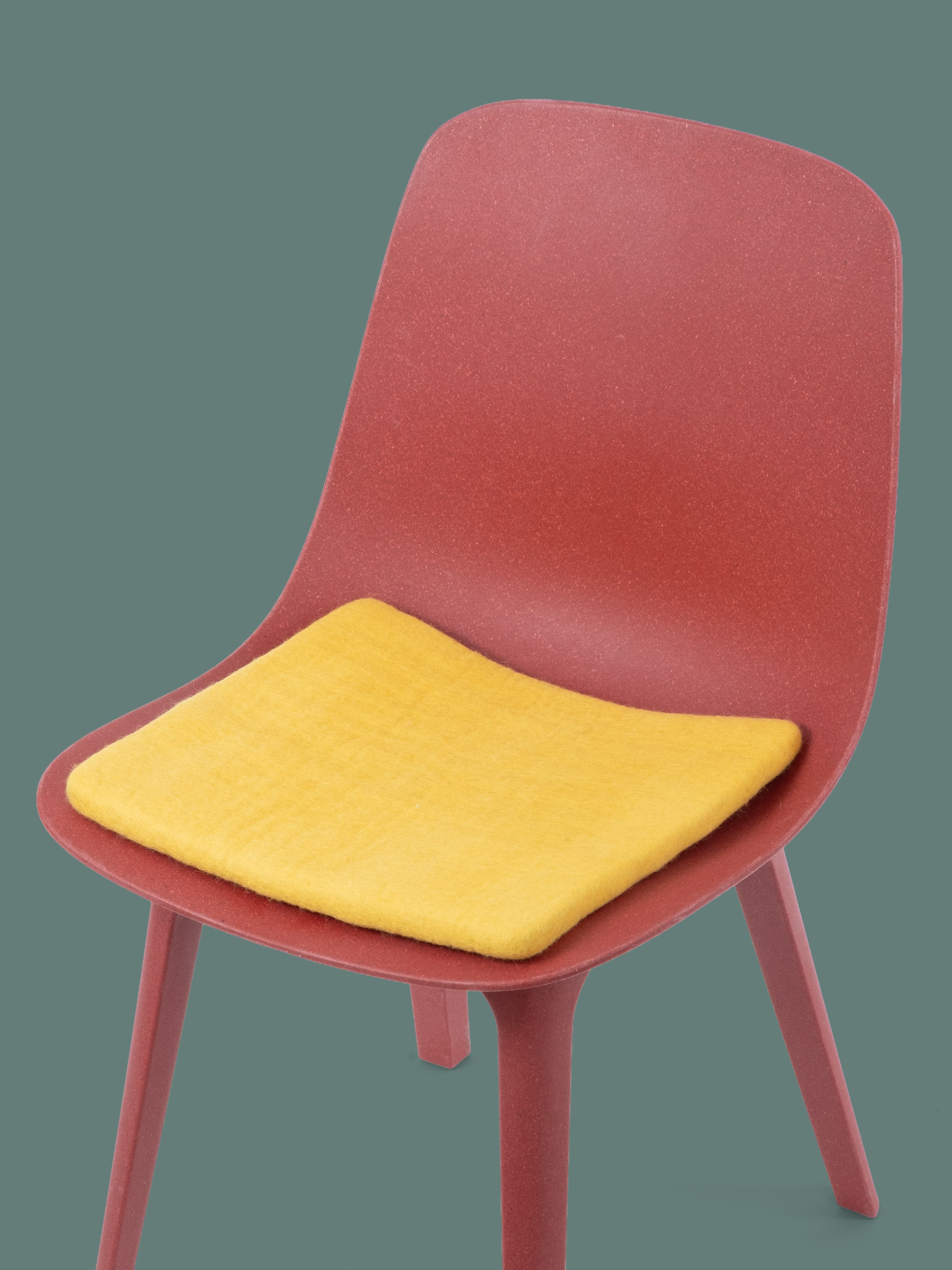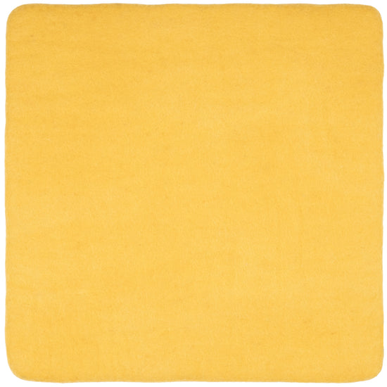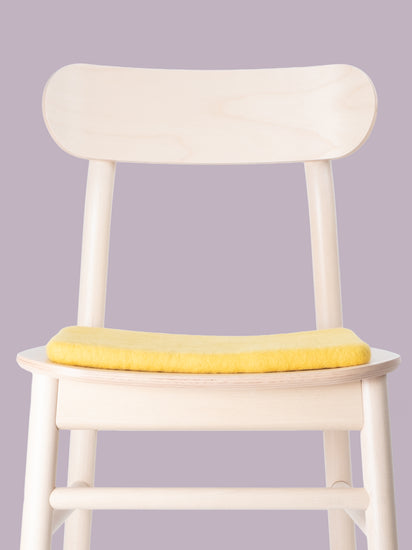 Quadratische, gelbe flache Sitzauflage aus reiner Schurwolle.