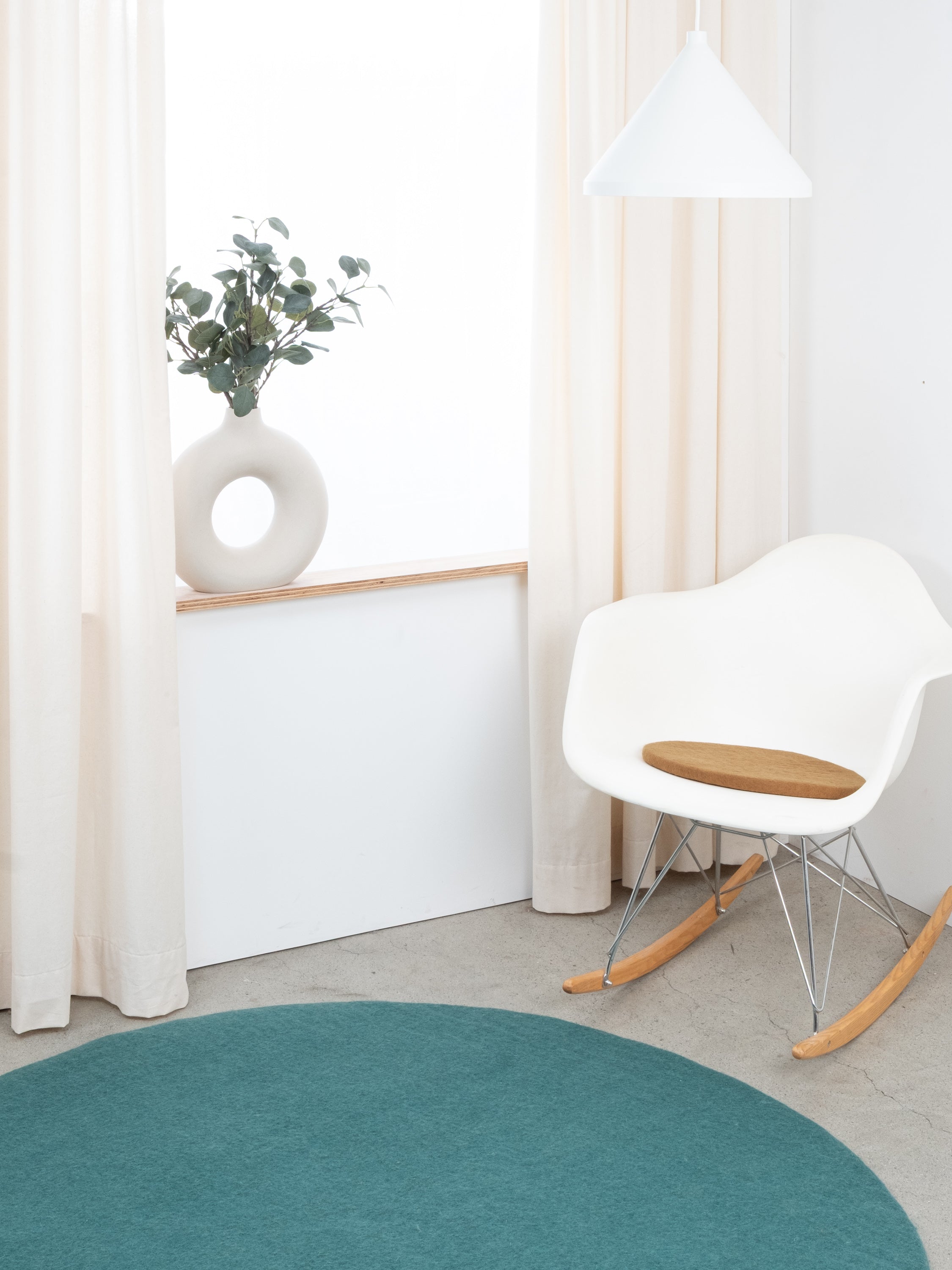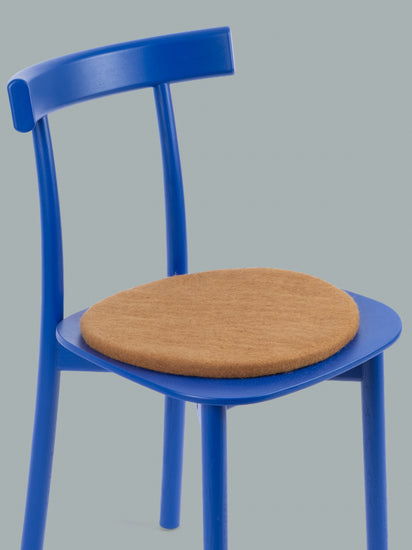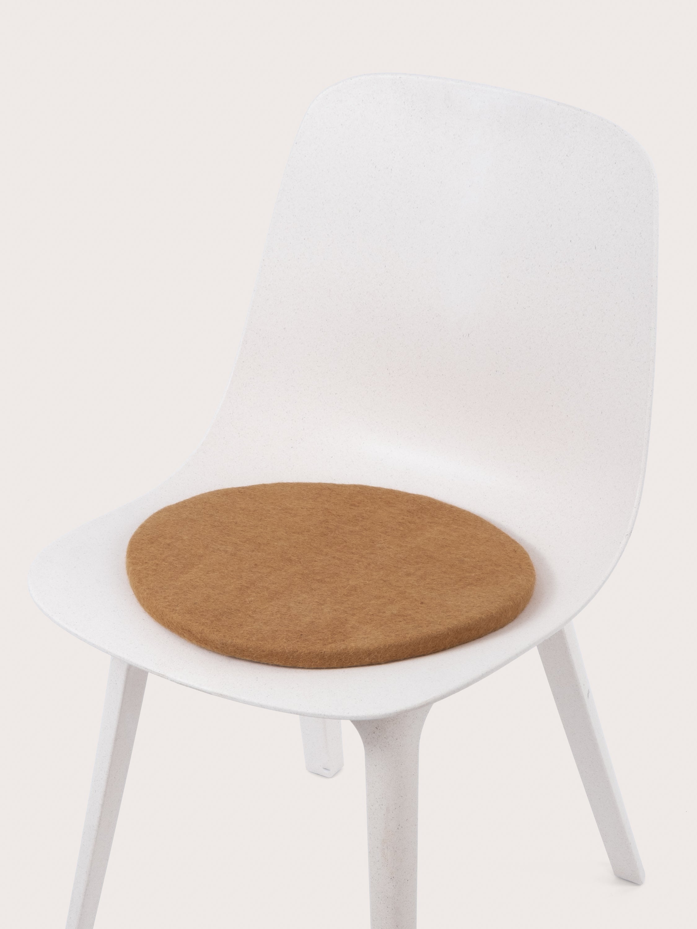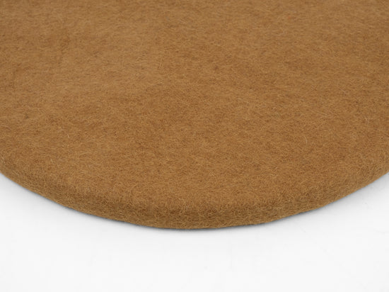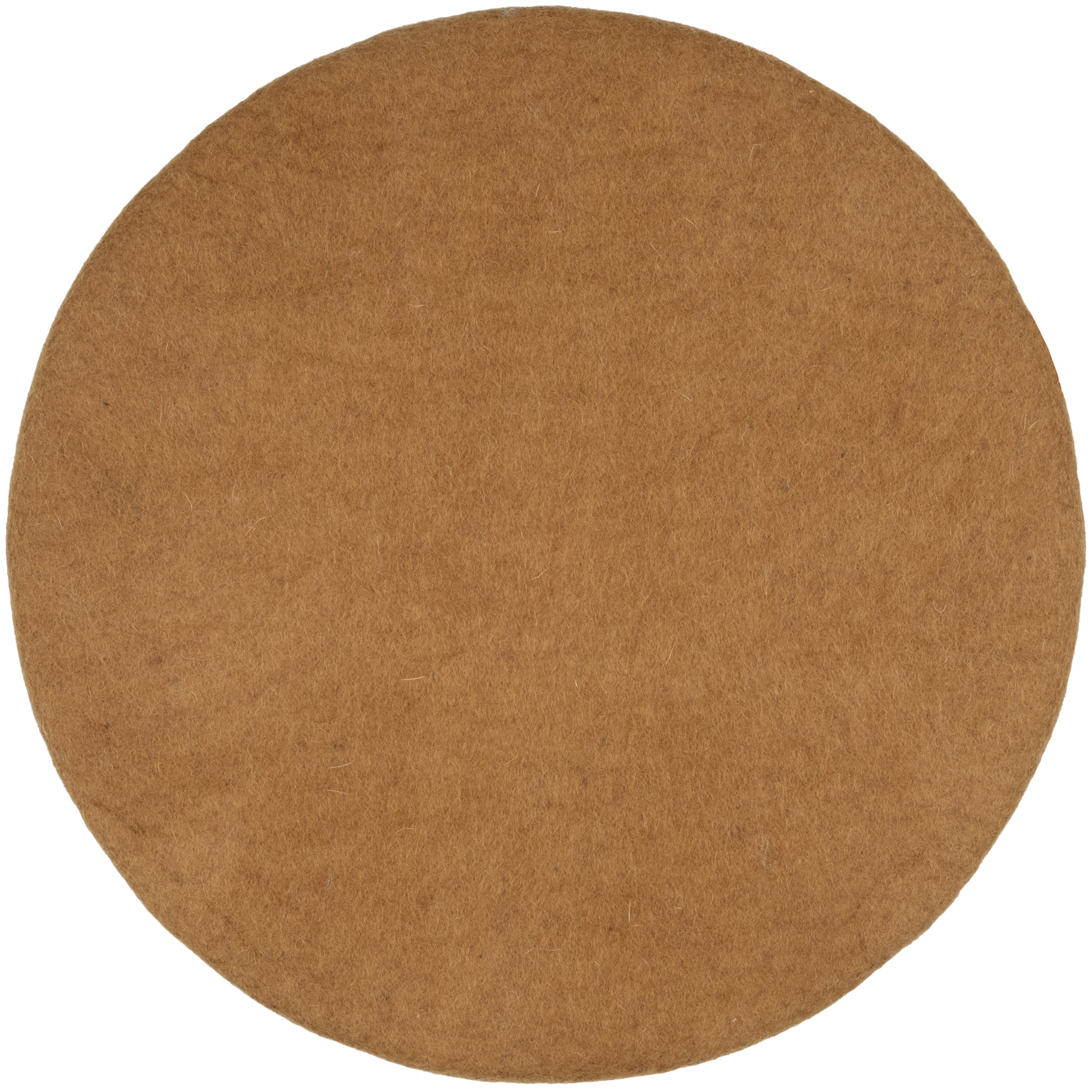 Runde, karamellfarbene flache Sitzauflage aus reiner Schurwolle.