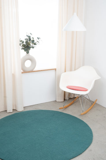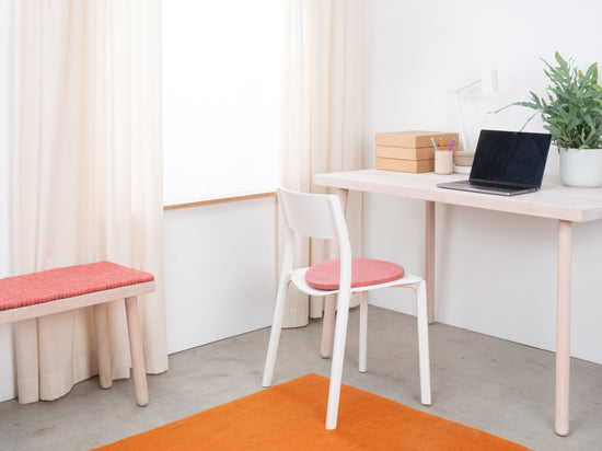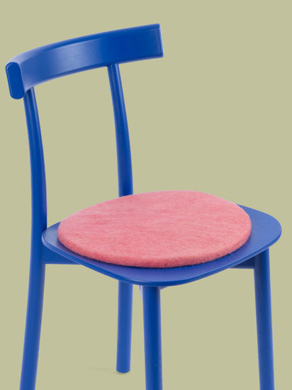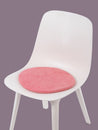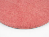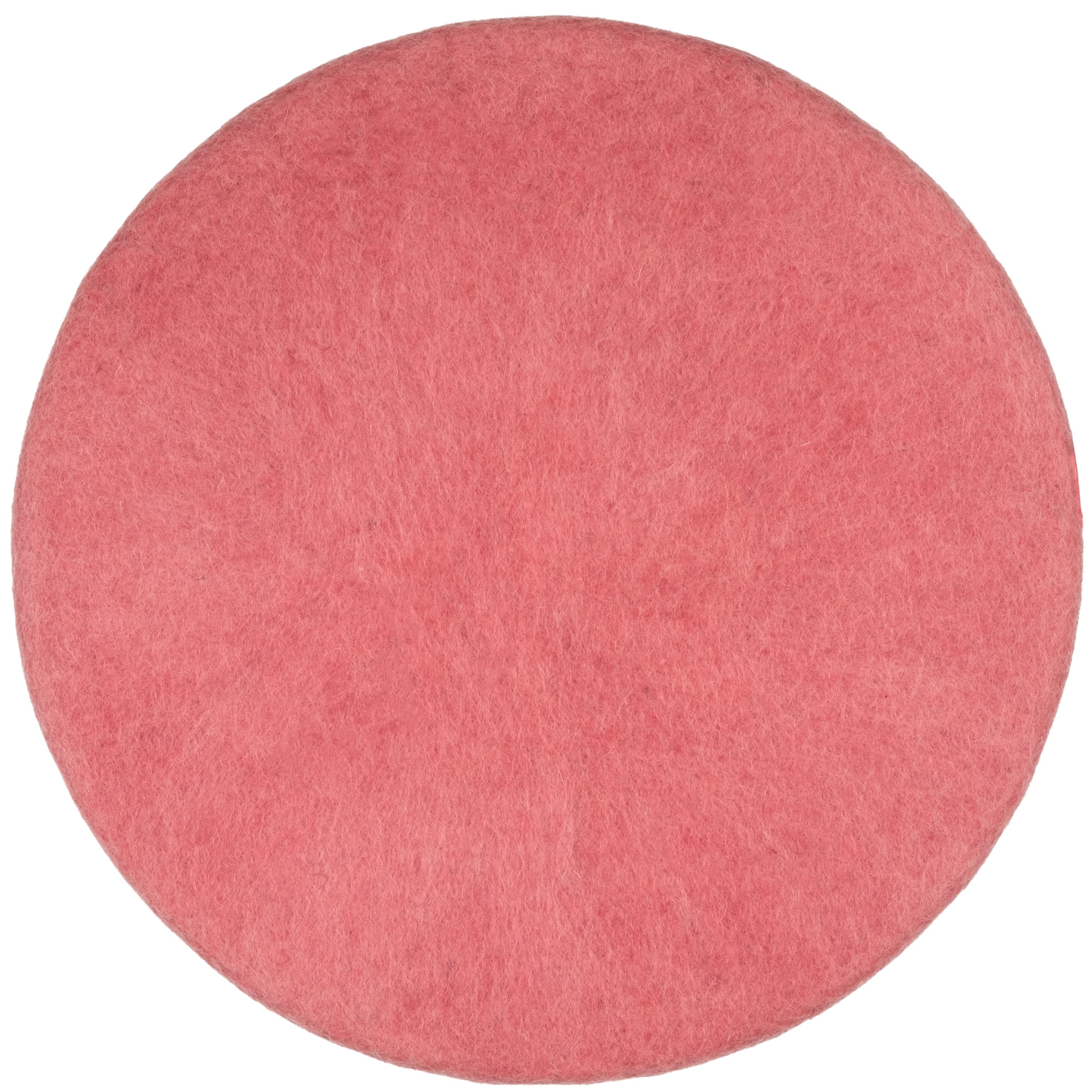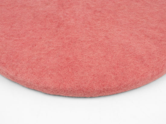 Runde, korallenrosa flache Sitzauflage aus reiner Schurwolle.