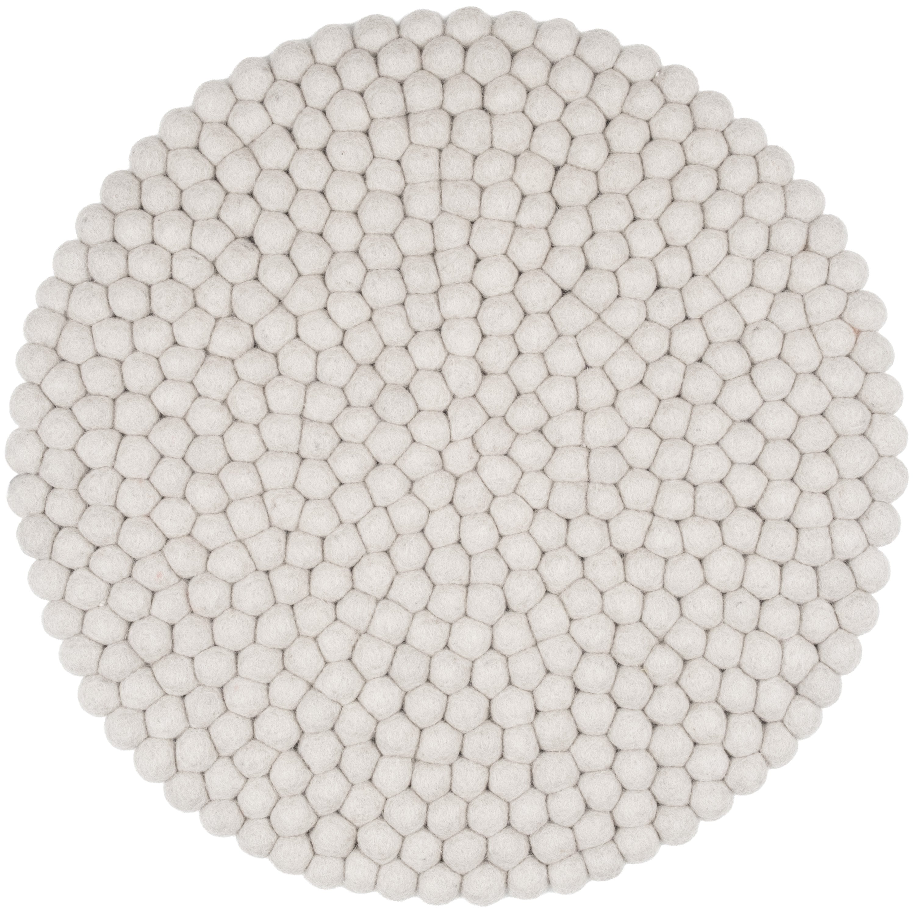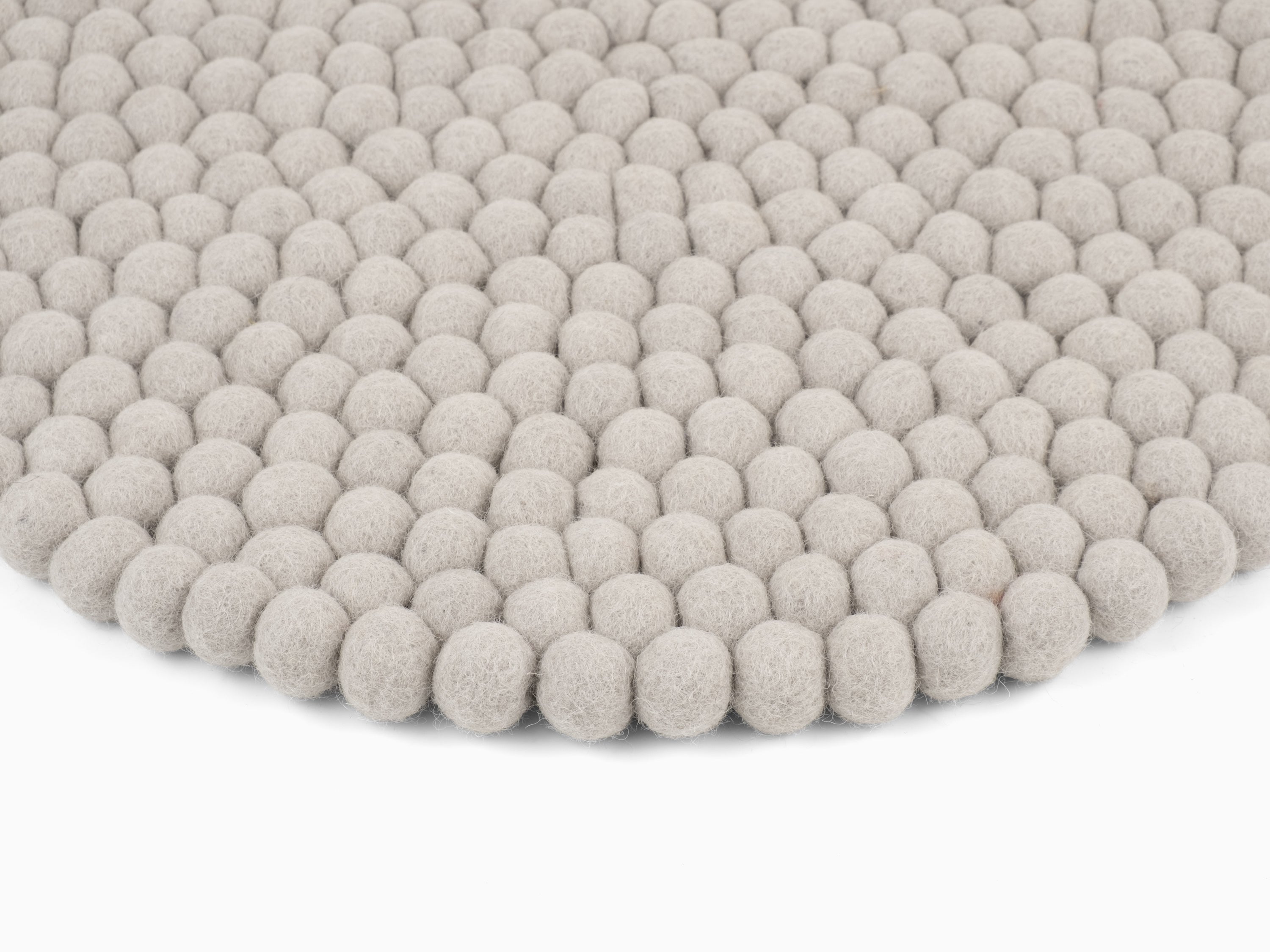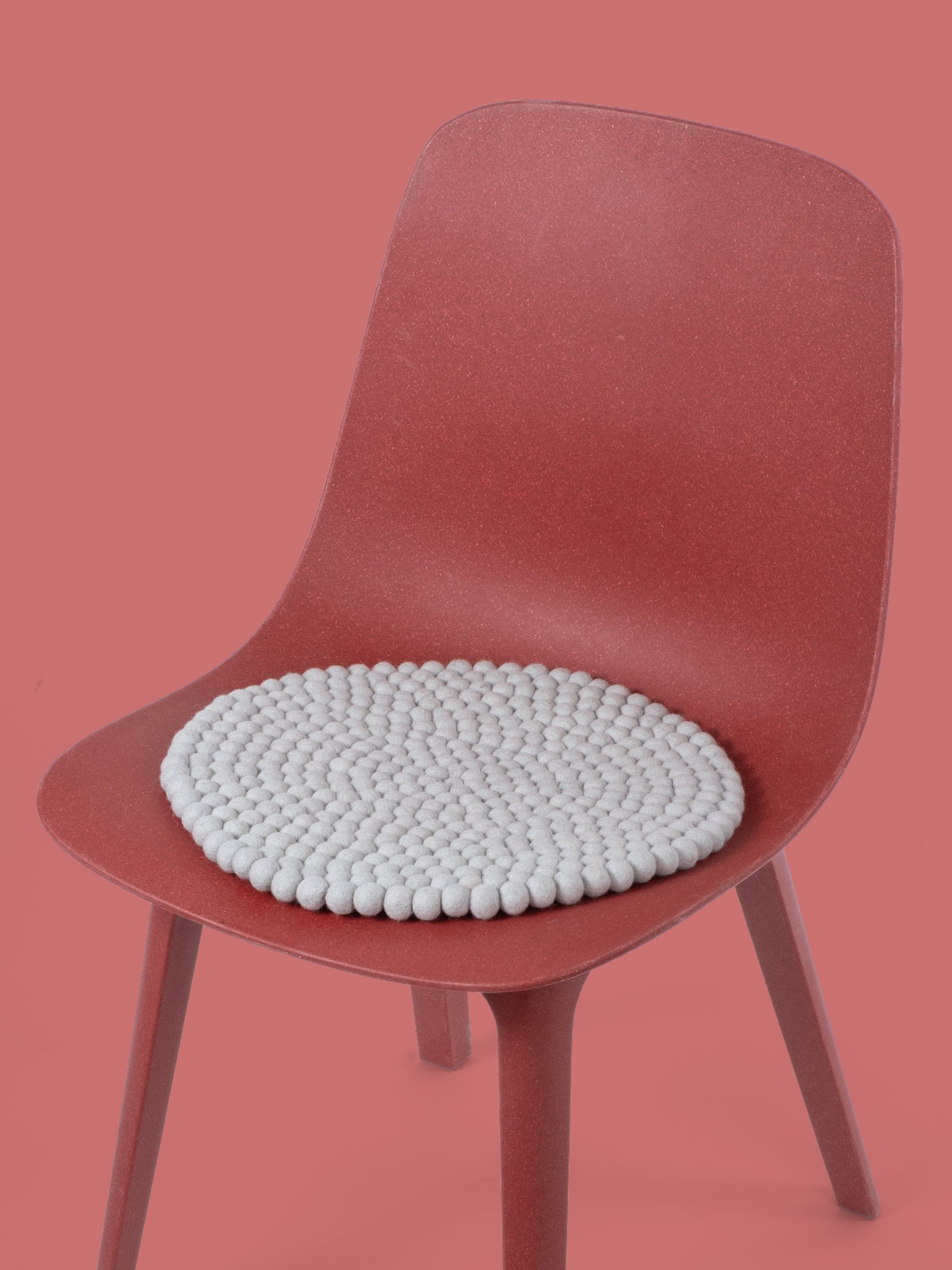 Runde, hellgraue Sitzauflage aus reiner Schurwolle.