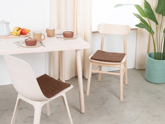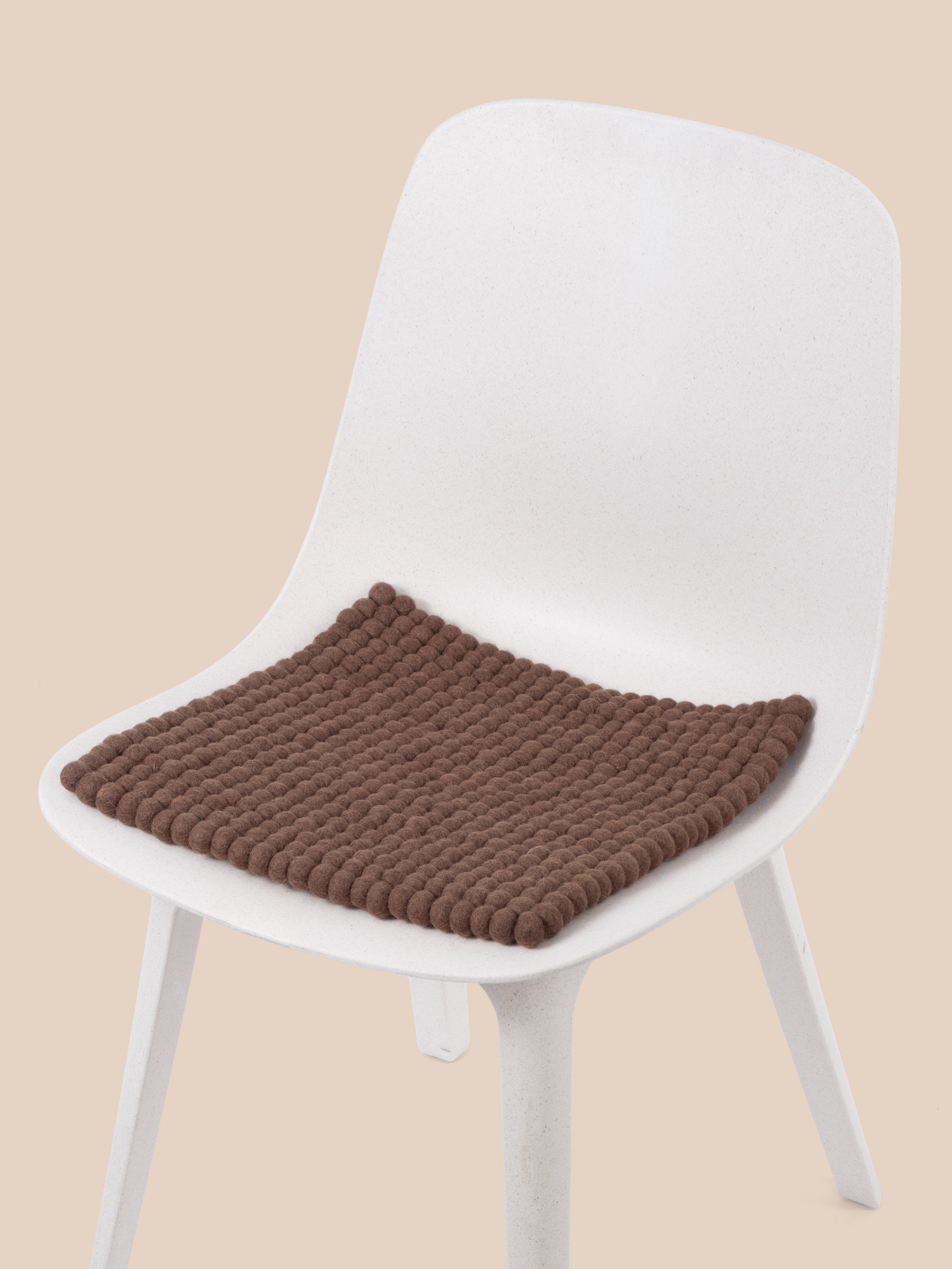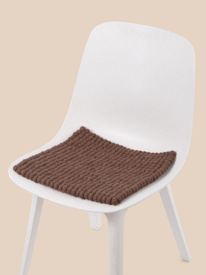 Quadratische, braune Sitzauflage aus reiner Schurwolle.
