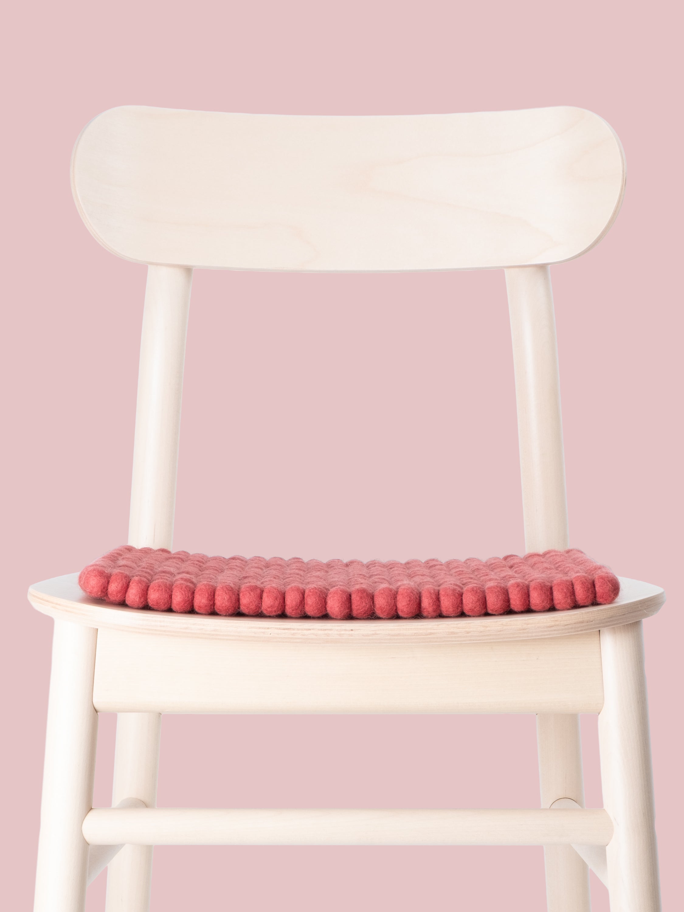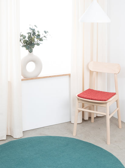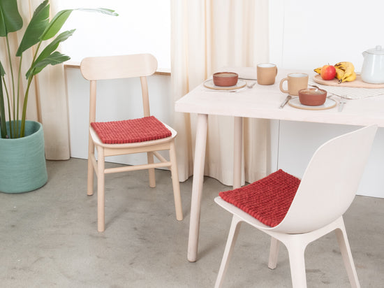 Il cuscino da sedia rosso vino Kaja porta calore e morbidezza sulla tua sedia preferita. Realizzato in pura lana vergine, fatto a mano in Nepal e prodotto in condizioni eque. I cuscini da sedia myfelt sono idrorepellenti e resistenti allo sporco e possono essere utilizzati su entrambi i lati.