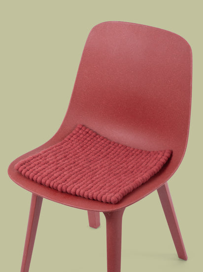 Quadratische, weinrote Sitzauflage aus reiner Schurwolle.