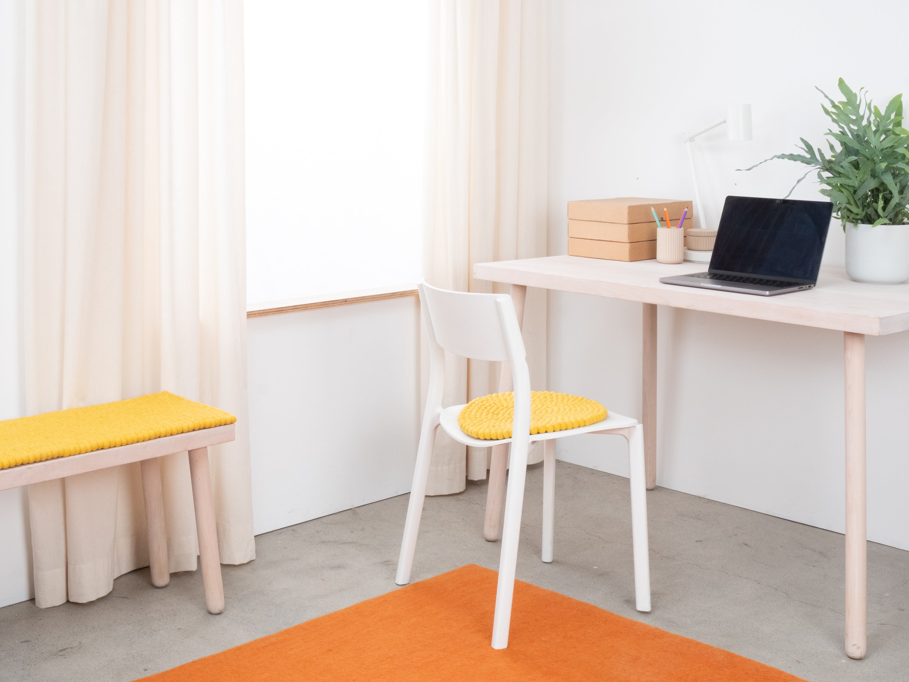 Runde, gelbe Sitzauflage aus reiner Schurwolle.