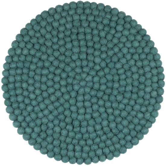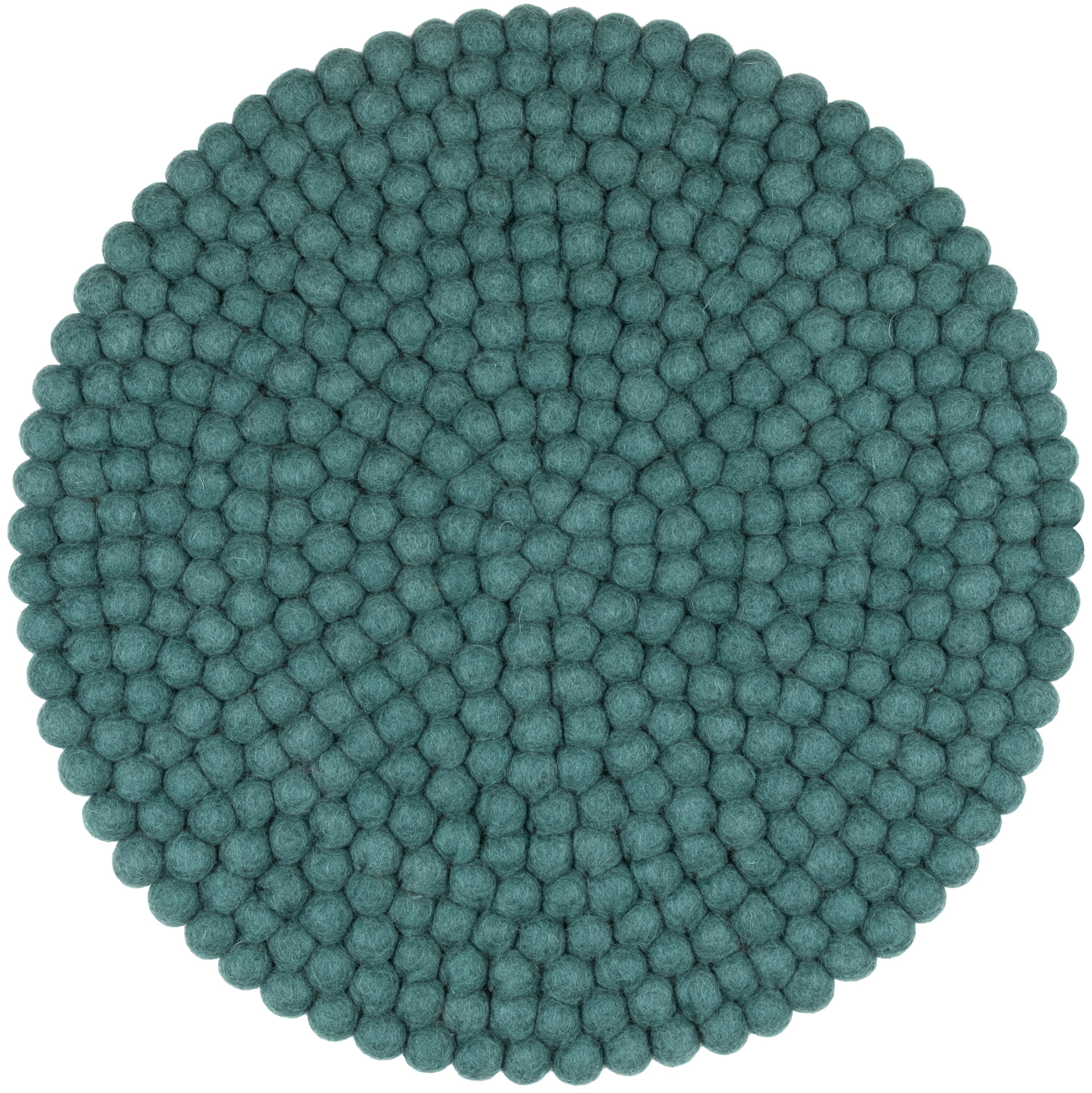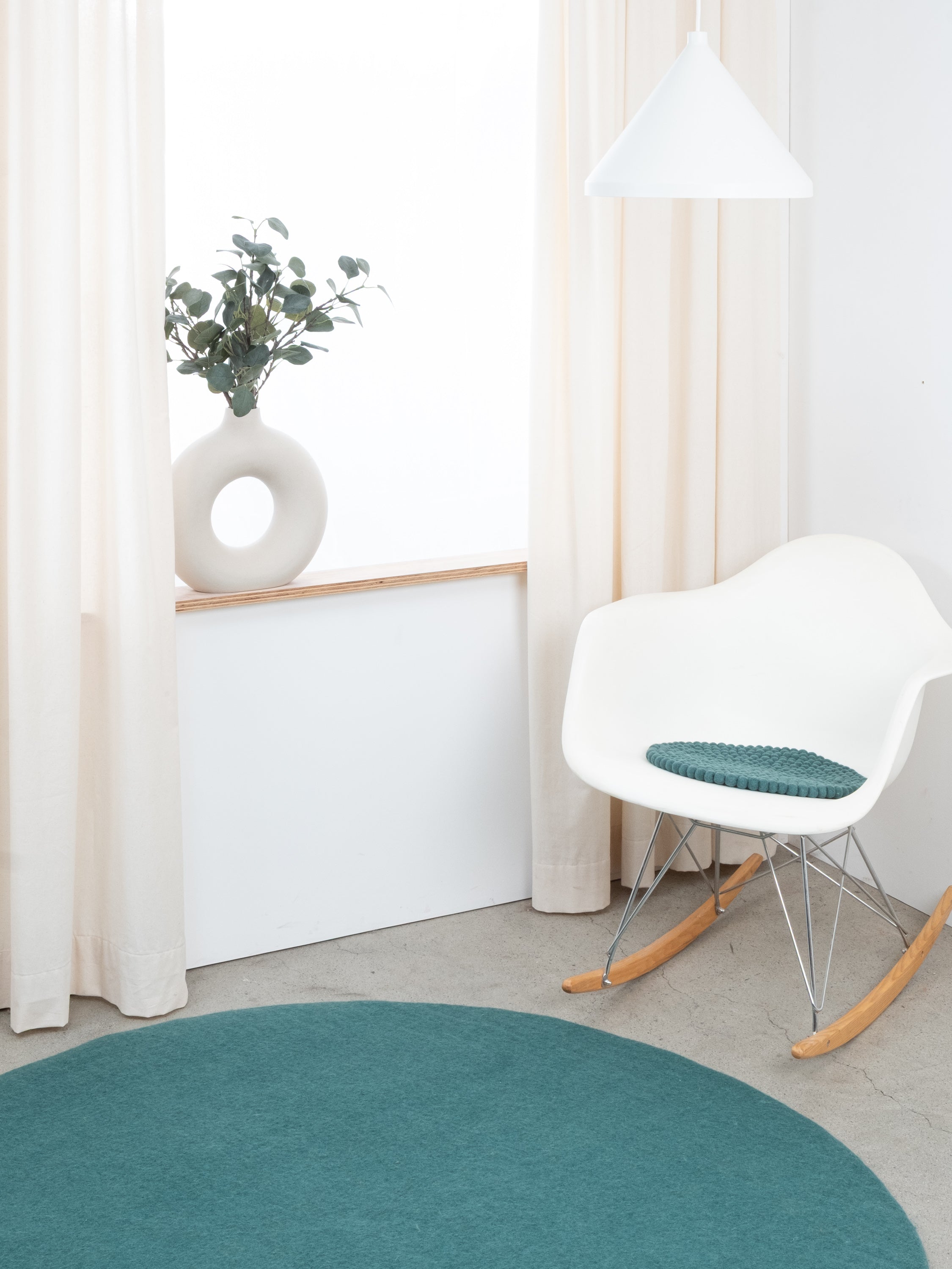 Runde, petrolfarbene Sitzauflage aus reiner Schurwolle.