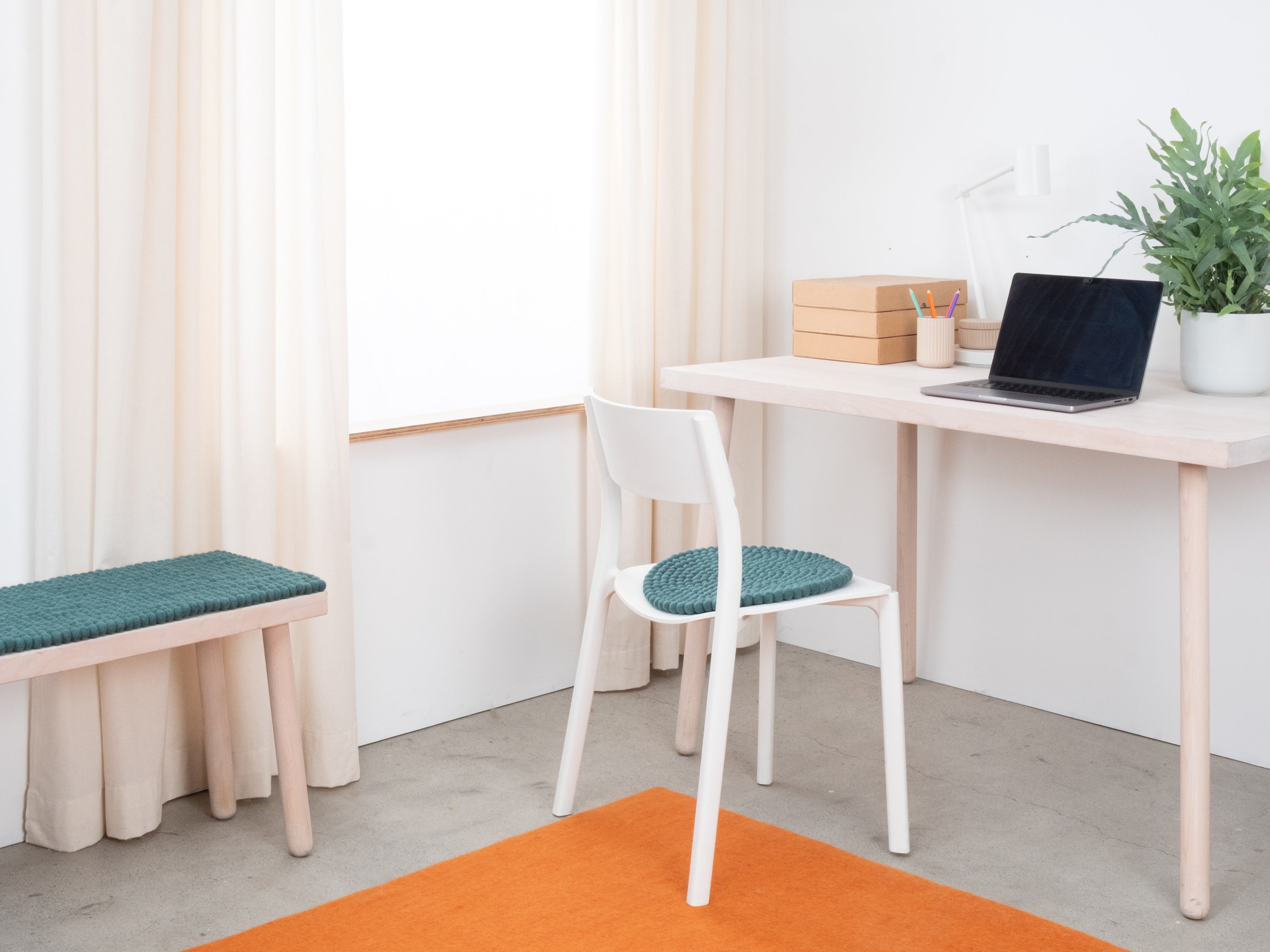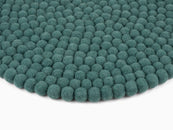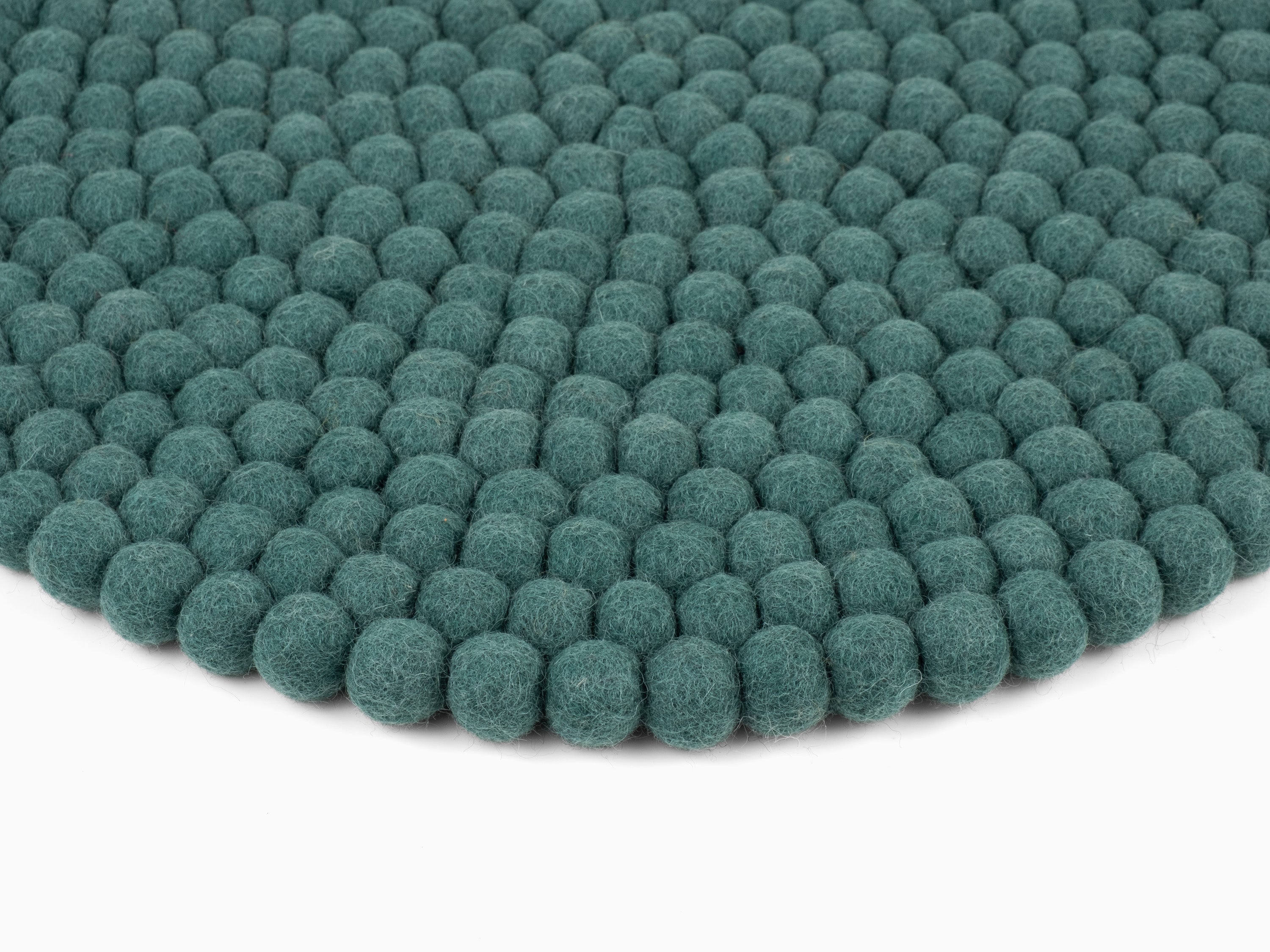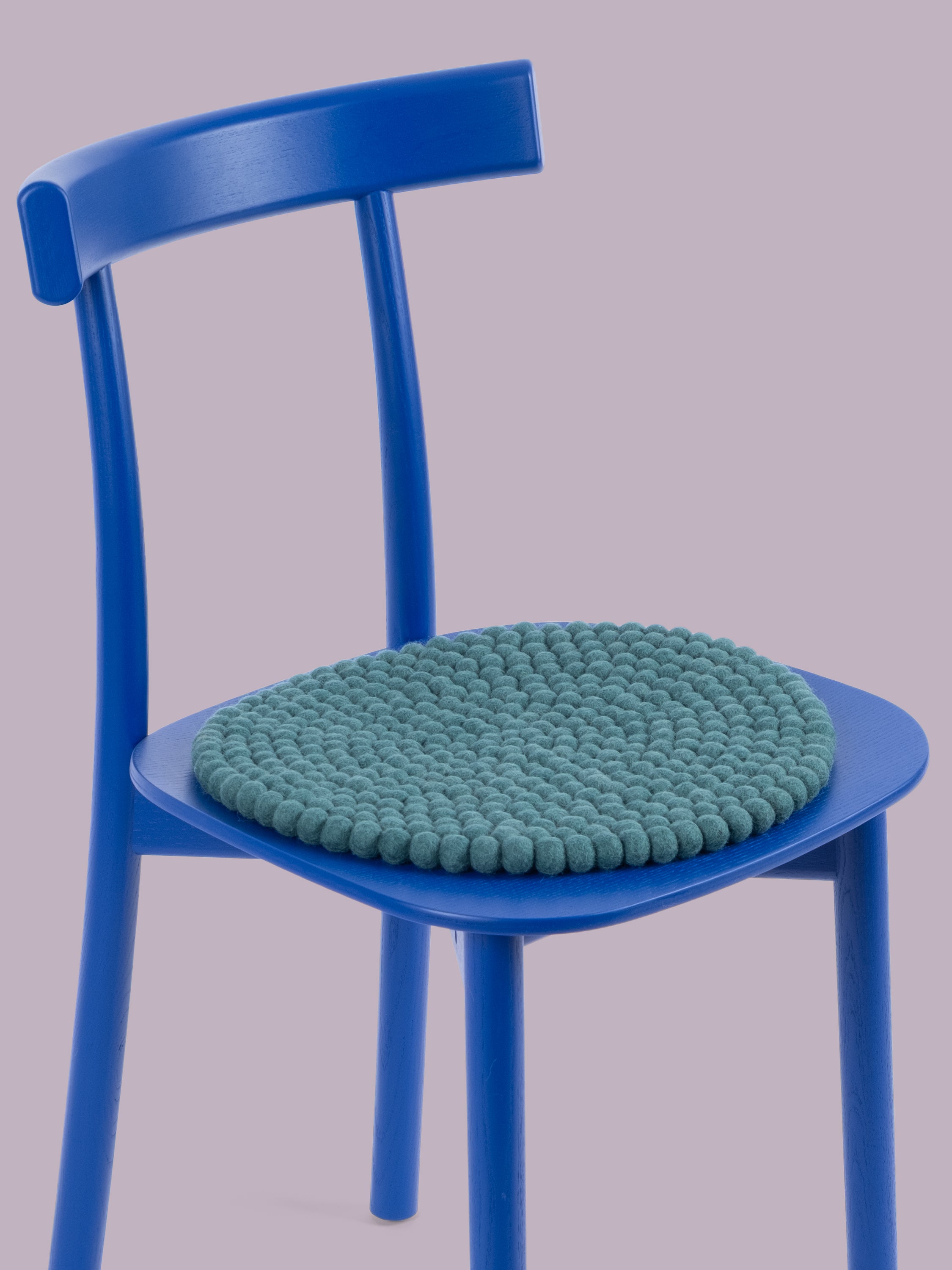 Runde, petrolfarbene Sitzauflage aus reiner Schurwolle.