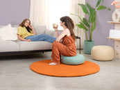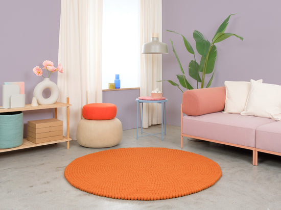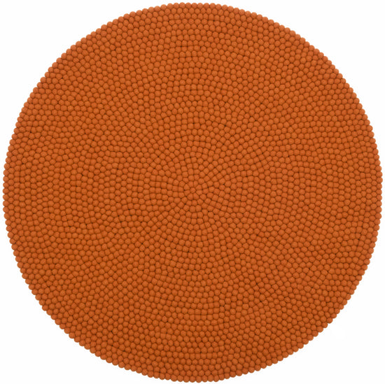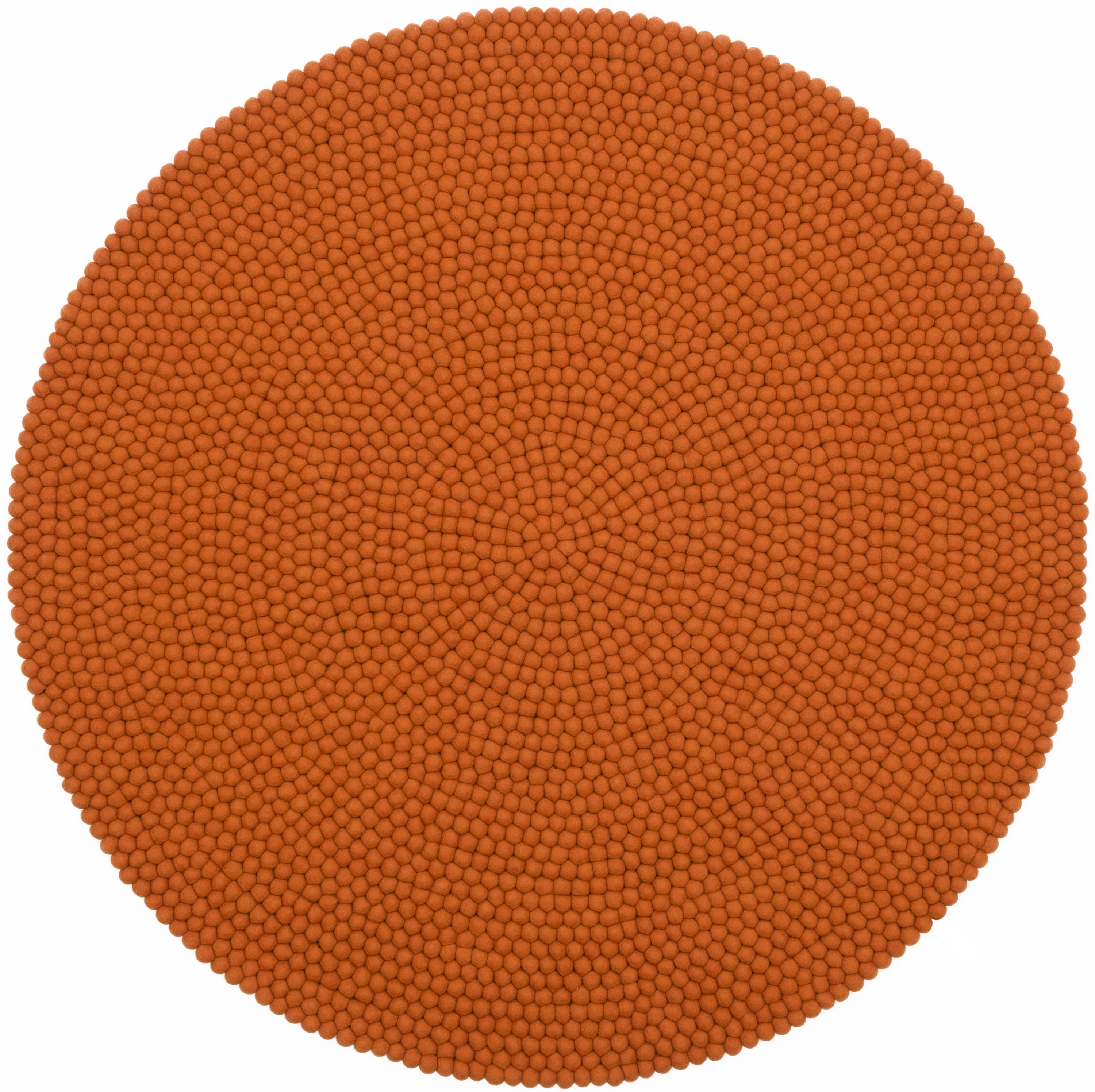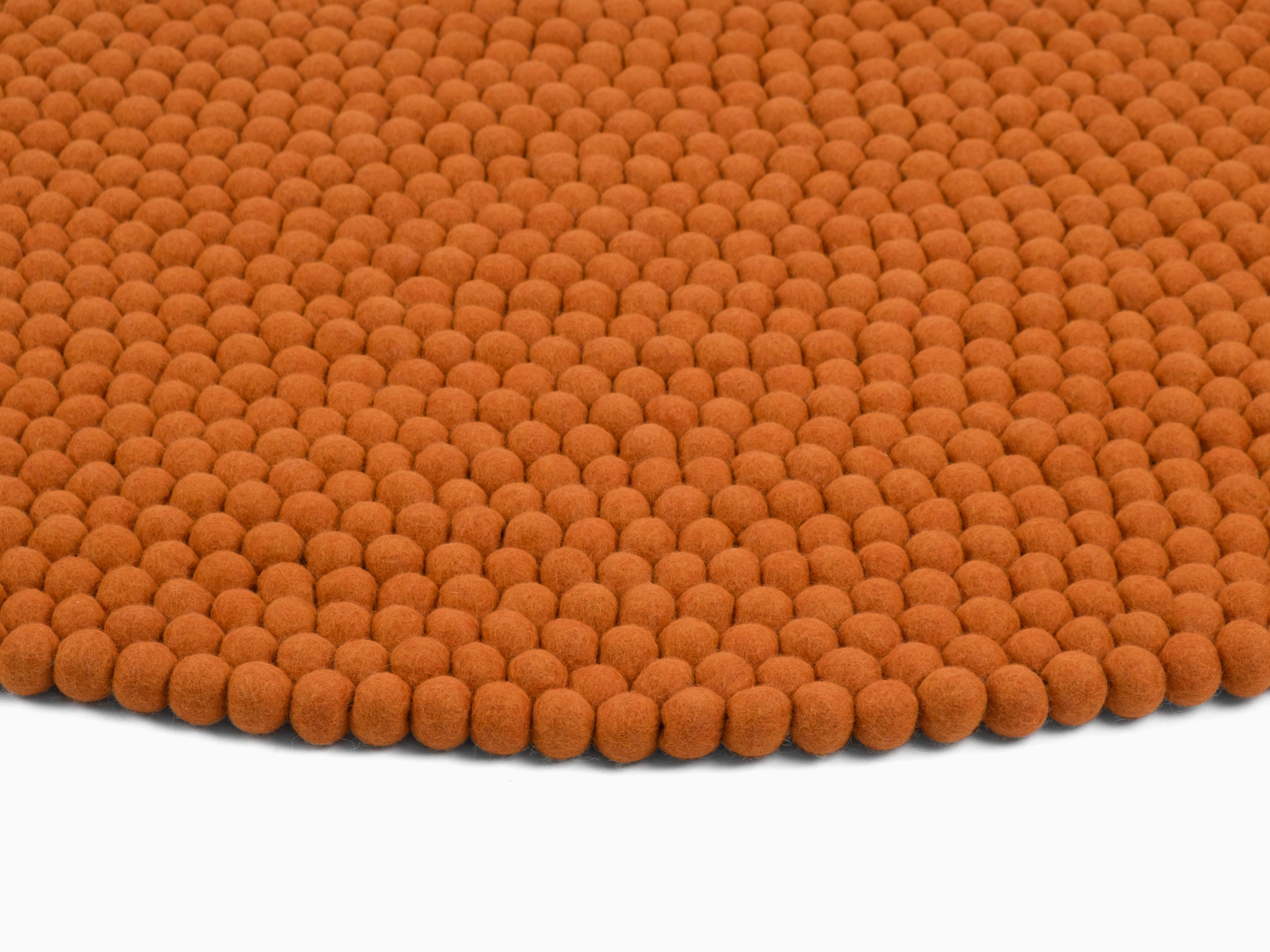 Tappeto rotondo in palline di feltro, realizzato in pura lana vergine.