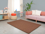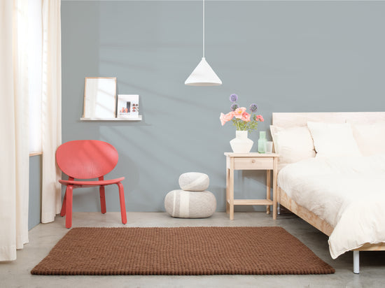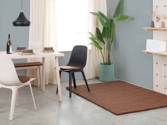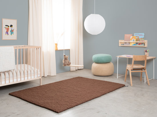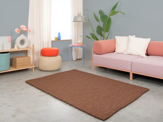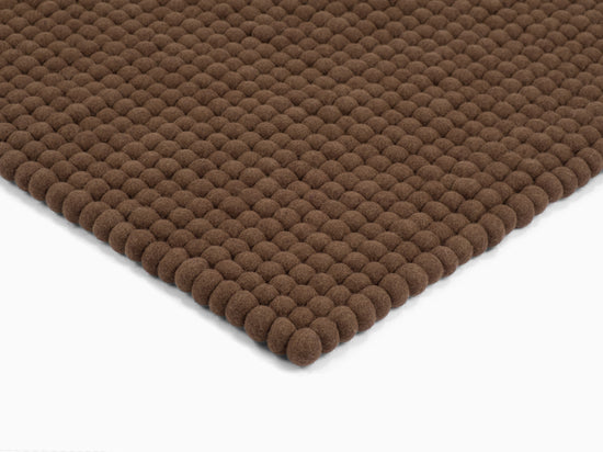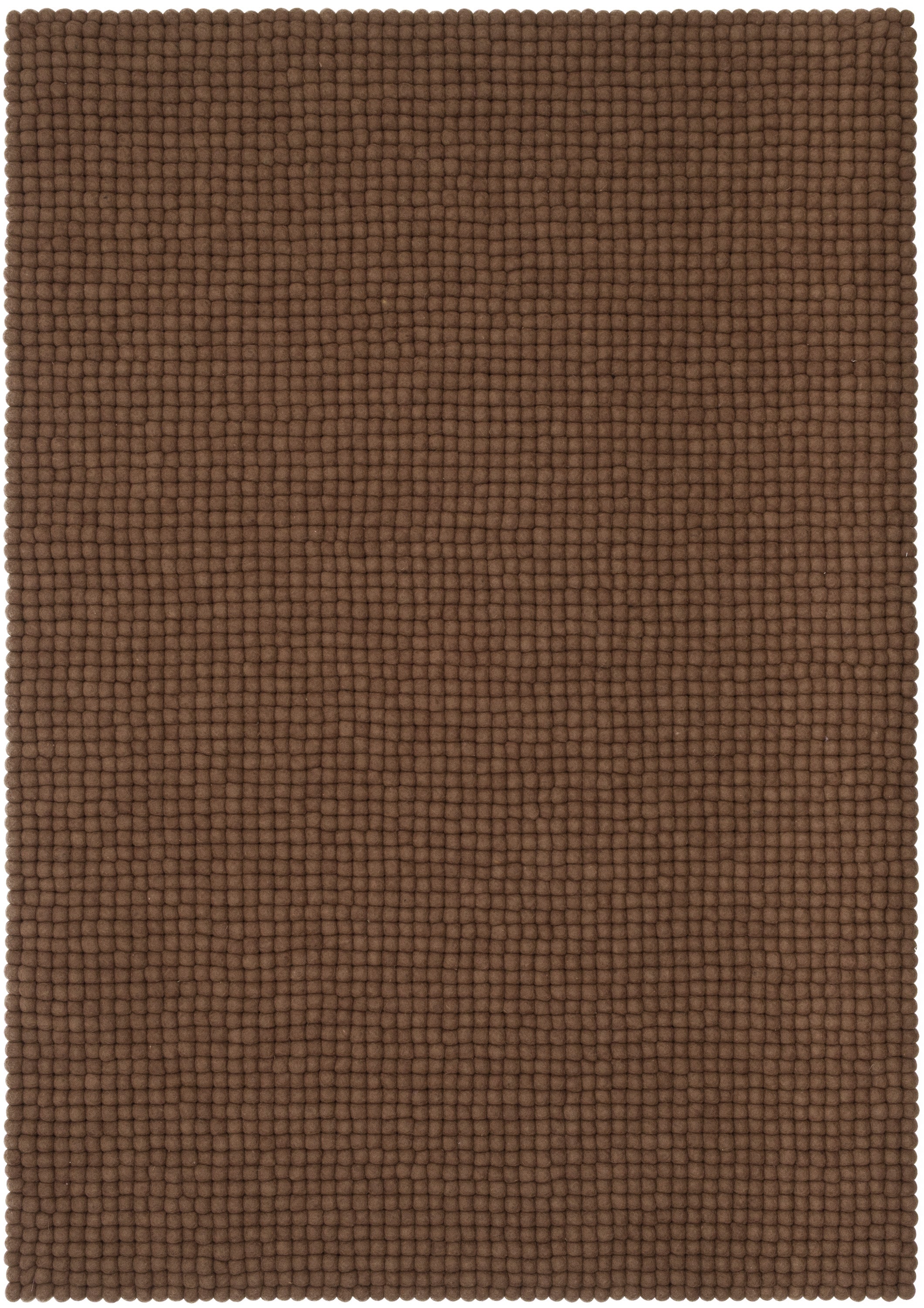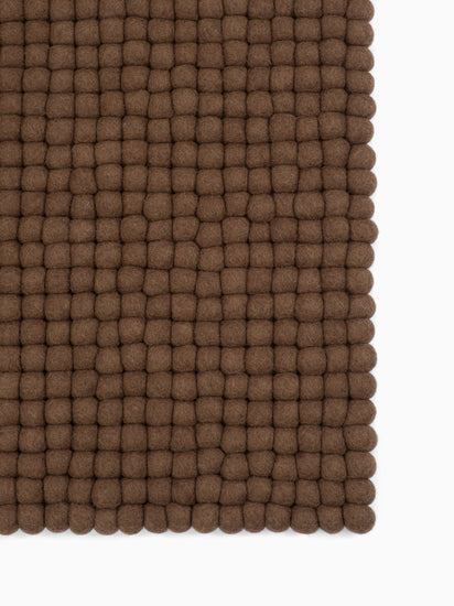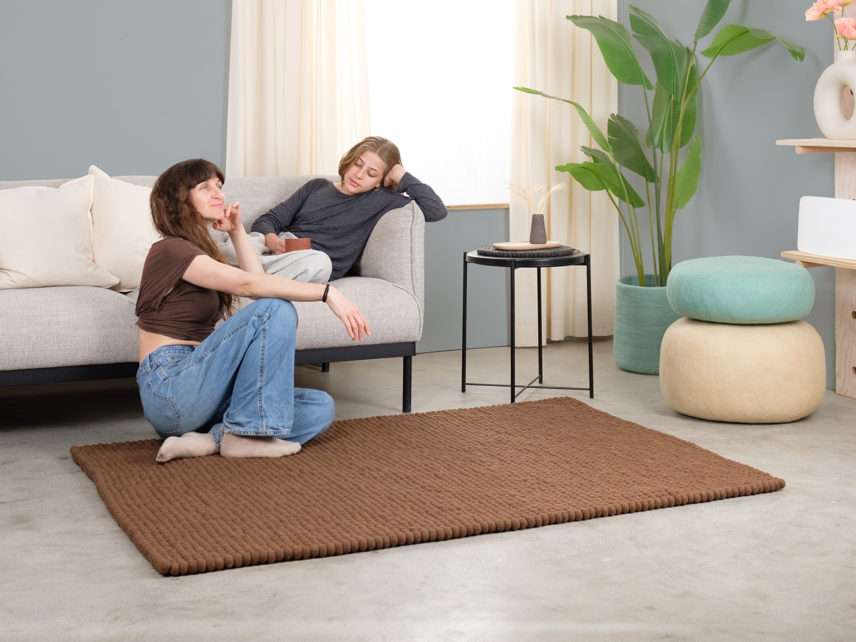 Egon punta su un caldo marrone cioccolato. Il tappeto di palline di feltro dà radicamento a ogni ambiente, creando comfort e struttura. Ideale per angoli lettura e zone giorno che richiedono calore. Resistente, indeformabile e piacevole sotto i piedi. Realizzato a mano in Nepal – 100% pura lana vergine.