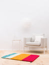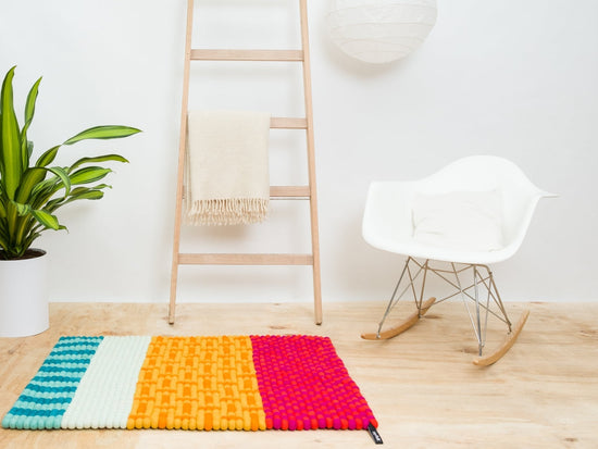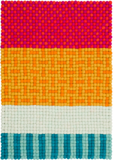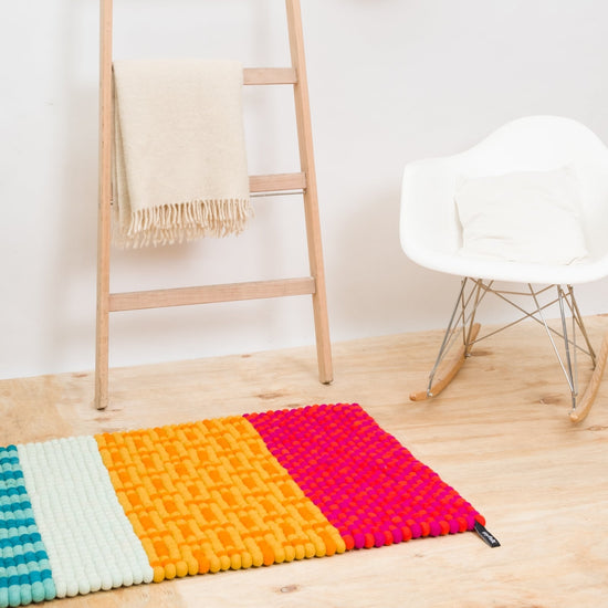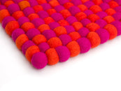 Tappeto rettangolare in palline di feltro realizzato in pura lana vergine.