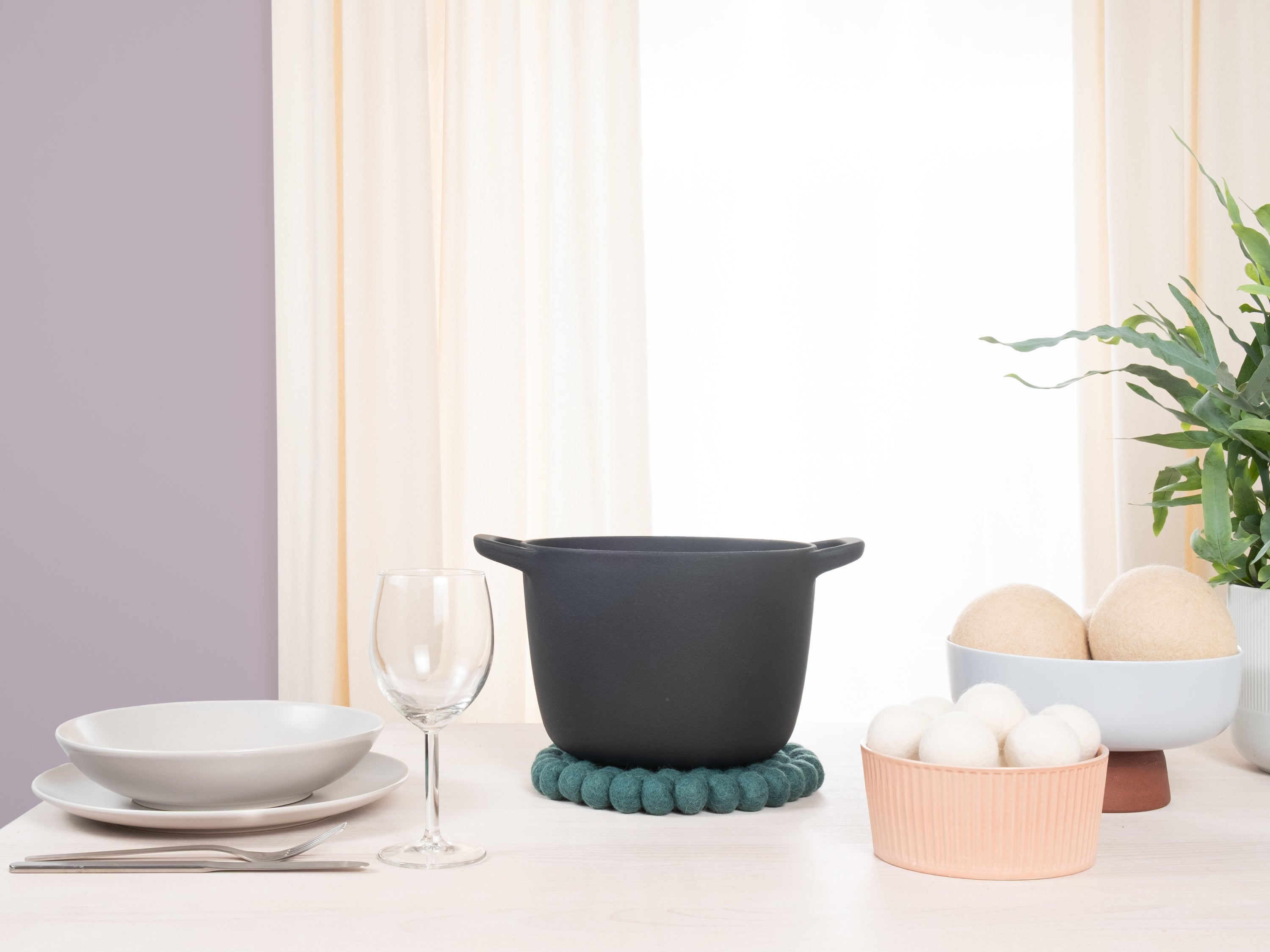 Il sottopentola Noah nel colore petrolio unisce funzionalità ed estetica accattivante. Robusto, resistente al calore, idrorepellente e antimacchia, e utilizzabile su entrambi i lati. Realizzato in pura lana vergine, fatto a mano in Nepal in condizioni eque.
